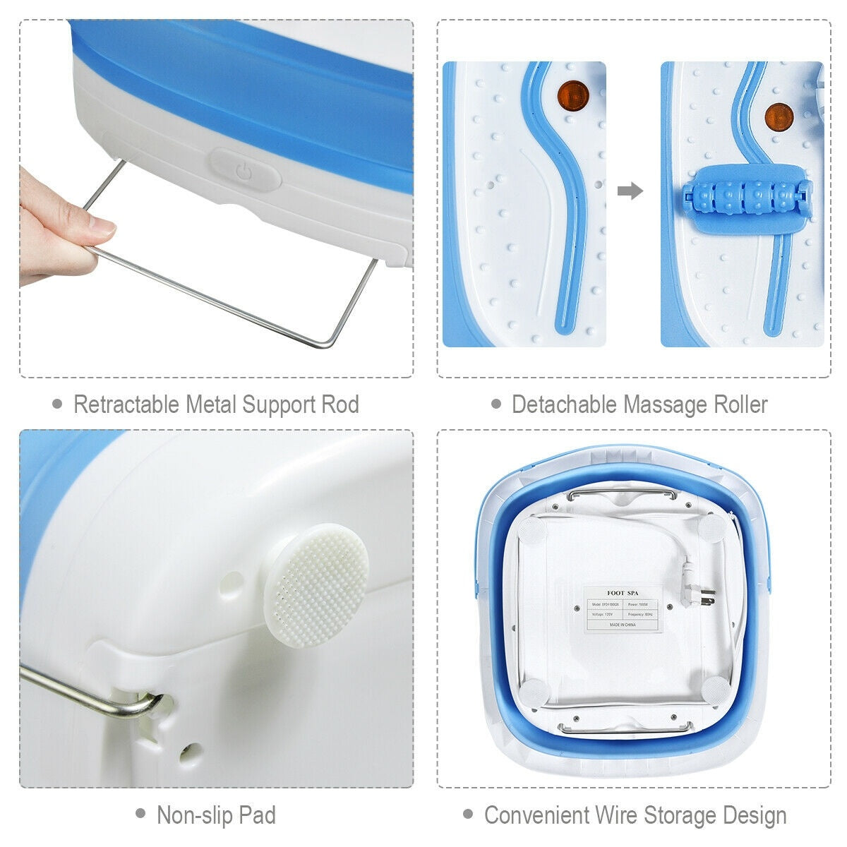 Color: As the picture shows Material: PP TPR metal rods Overall dimension: 14.5" x 16.5" x 8.5" (L x W x H) Folded size: 14.5" x 16.5" x 4" (L x W x H) Net weight: 5 lbs Power: 120V/60Hz Power consumption: 500 W Running temperature: 77°F - 118°F Wire length: 5.9' Package includes: 1 x Collapsible foot bath massager 1 x Pumice stone 1 x Scrub brush 1 x Roller massager 1 x Instruction